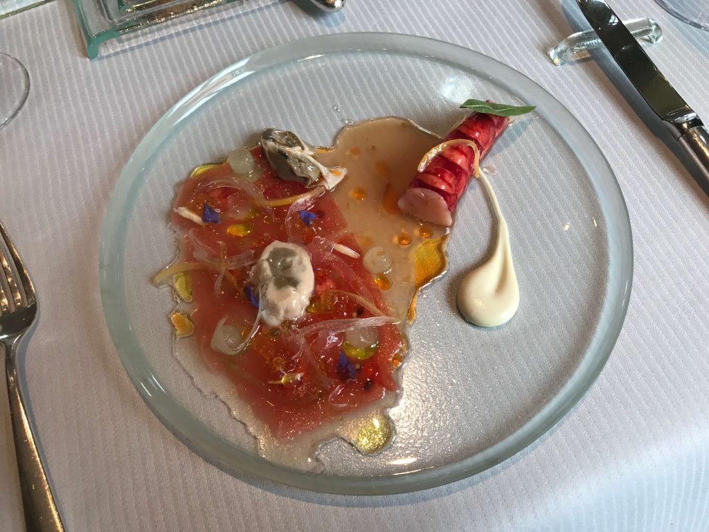I had this course at a ***-michelin star lunch at Restaurant Vendôme, Bensberg. Grand chef Joachim Wissler composed Carabinero and Gillardeau Oyster on watermelon, grilled tomato and lemon-buttermilkcreme. To be honest, this is the best course I had in my entire life. The combination of sour and sweet parts and different textures is amazing. On top i absolutely love oysters and also carabineros are one of my favs. When I sat at the restaurant, tbh, I had tears in my eyes.